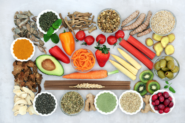 식이섬유가 풍부한 다양한 음식들이 보기 좋게 진열되어 있습니다.