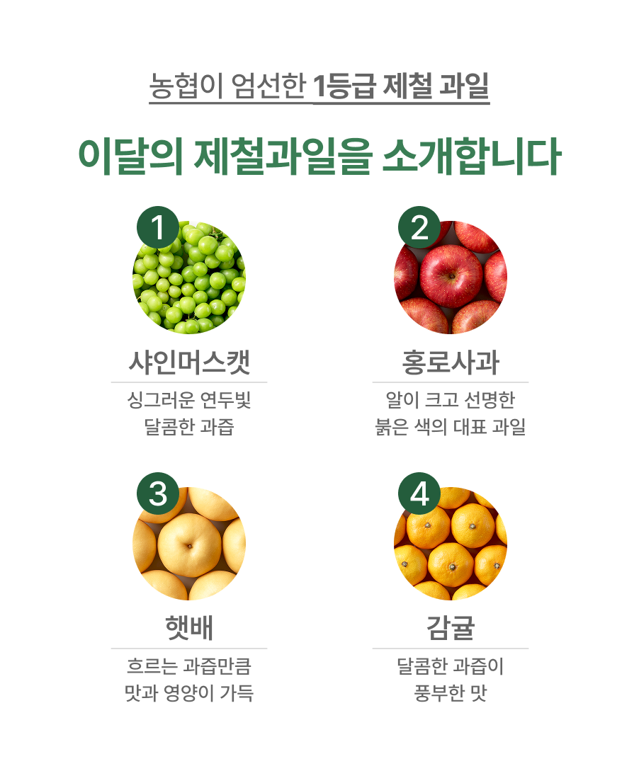 - 다양한 과일: 사과, 배, 포도, 무화과, 감, 사과대추, 밤까지! 각양각색의 맛과 영양을 즐길 수 있답니다.