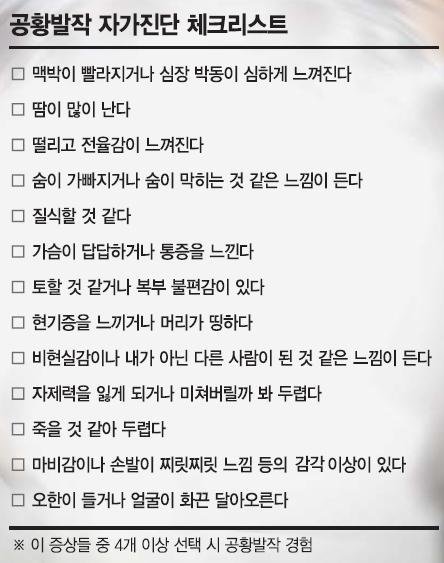 여러분들께서 읽어 보시니까 어떤가요? 본인에게 공통되는 증상이 있으세요? 만일 여러분들께 이 같은 증상이 4가지 이상 나타나면 공황장애를 한 번 수상해봐야 하고요.