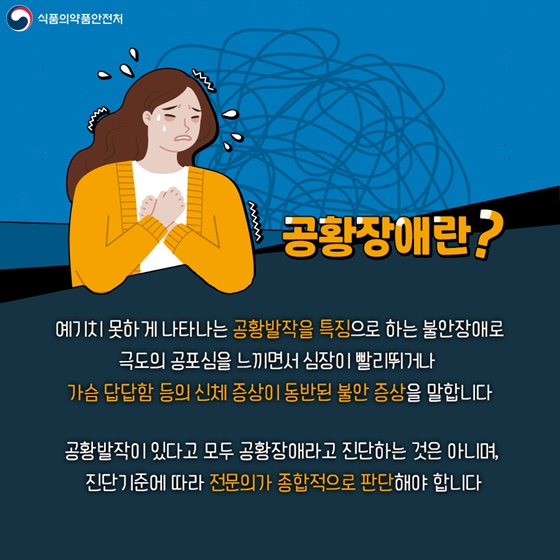 바로 이러한 상태, 위험하였거나 불안해야 할 경향이 아닌데도 큰 불안을 알게되는 상태가 바로 '공황장애'라고 해요.